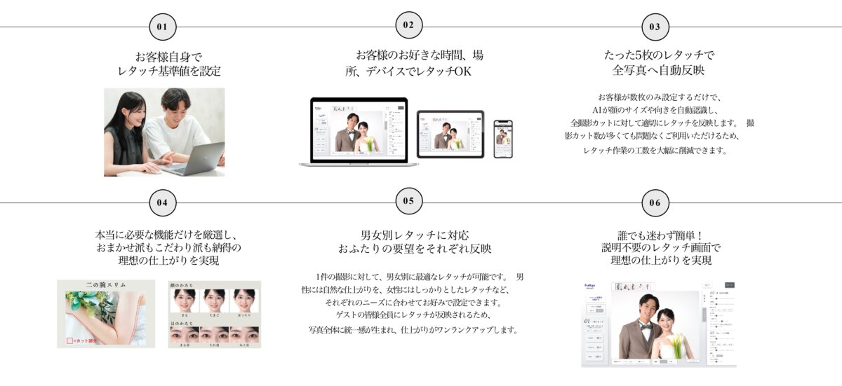 操作も簡単で、まずは事前にダウンロードしてあるお二人のお写真より5枚をセレクト頂き、5枚を理想の仕上がりにレタッチして頂きます。5枚は正面、横顔などなるべくランダムにお選び頂くとあらゆる角度に対応できます。
