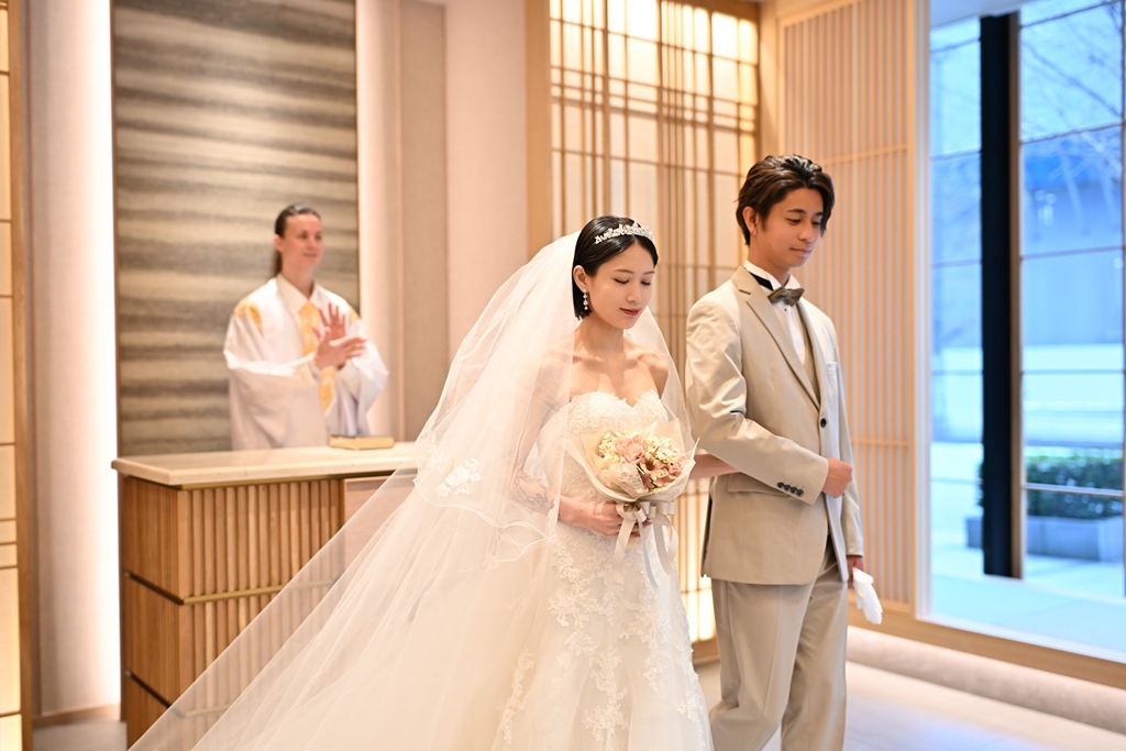 やわらかな光が差し込むモダンチャペルの空間で、誓いの瞬間を美しく撮影。ベールアップや指輪交換など、まるで本当の挙式のような感動的なシーンを写真に残せます。
