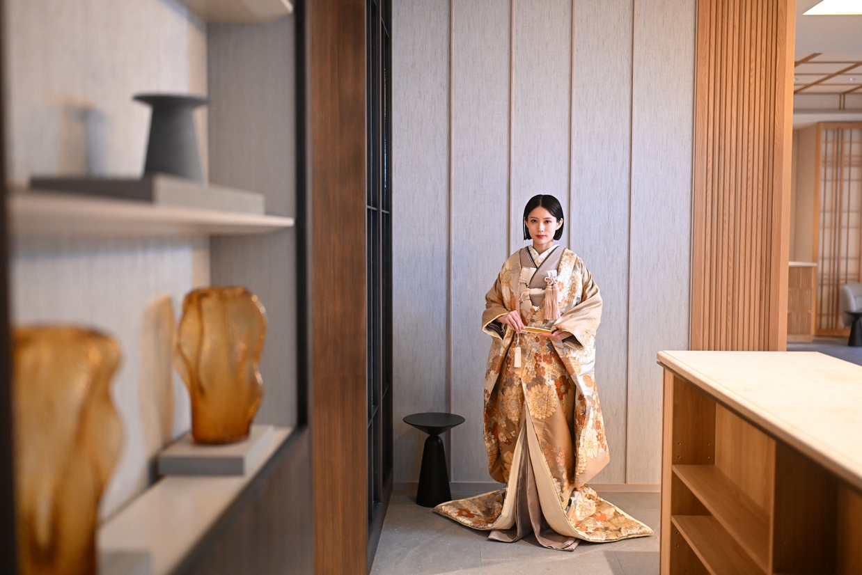 ウェディングの代名詞とも言える衣装決め。煌びやかなドレスフロアがお客様の昂る気持ちをより熱くします。和装チェストには色打掛と白無垢が展示されており、心ときめく空間が広がります。